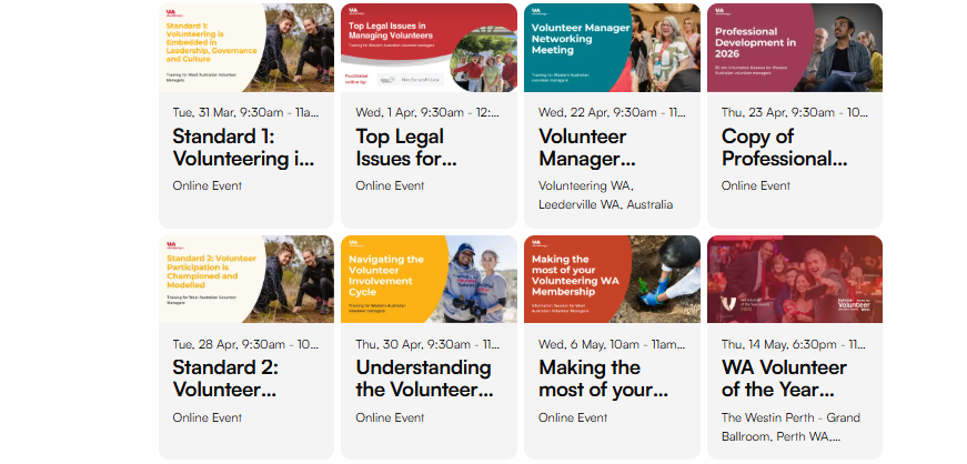 If you are registered for the CPD program, 12 points are awarded upon completion of the Cert IV in Coordination of Volunteer Programs, up to 2 points for Volunteering WA’s National Standards workshop.